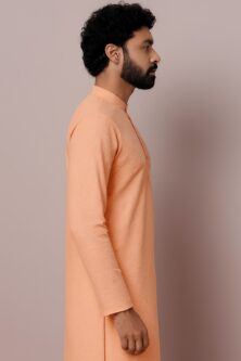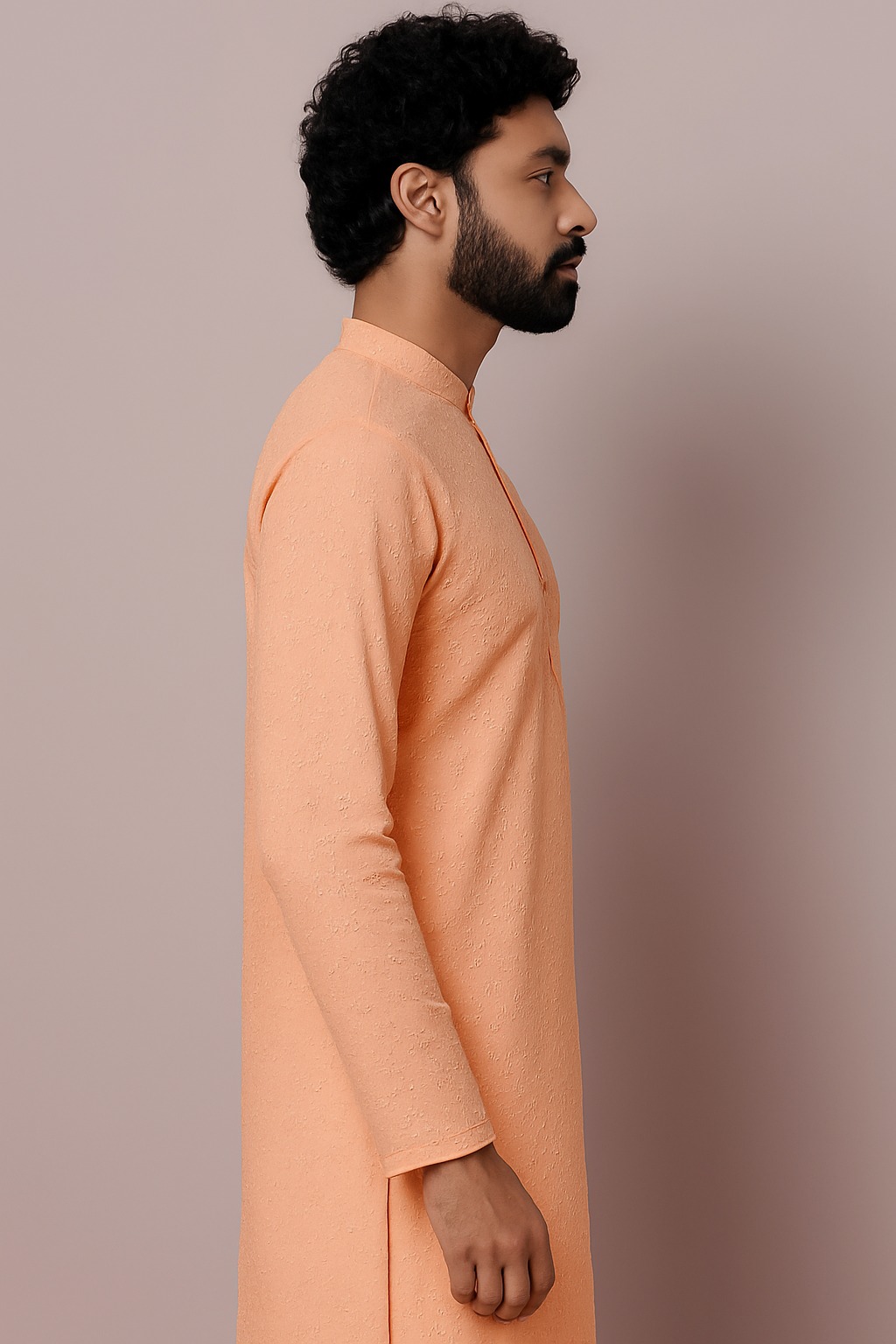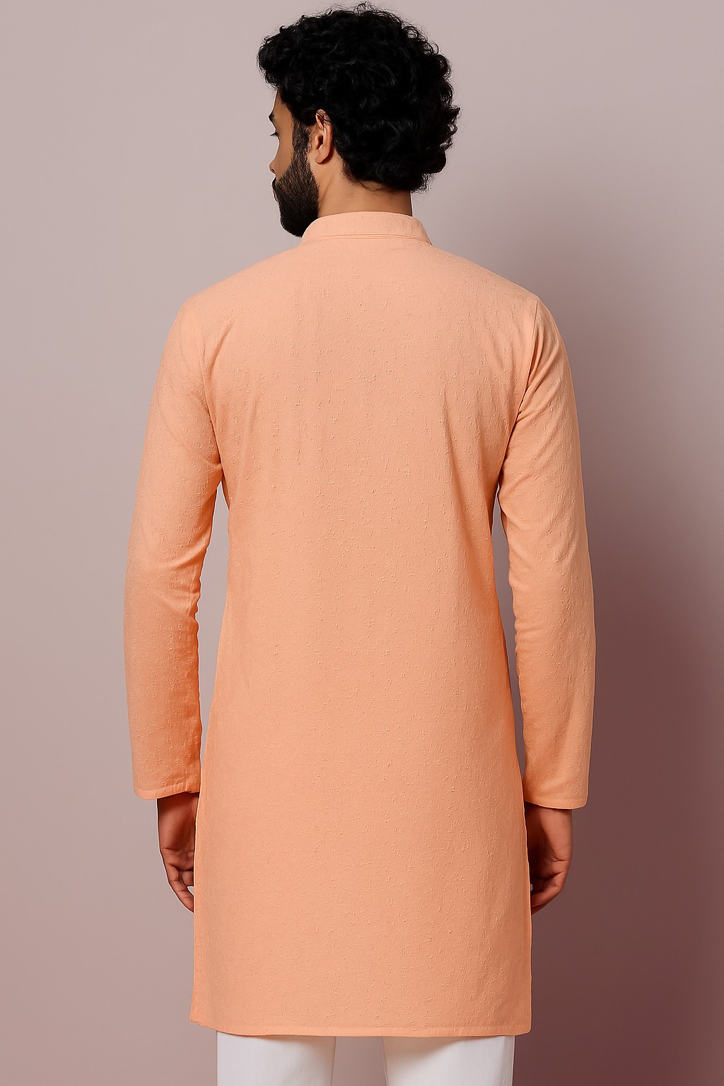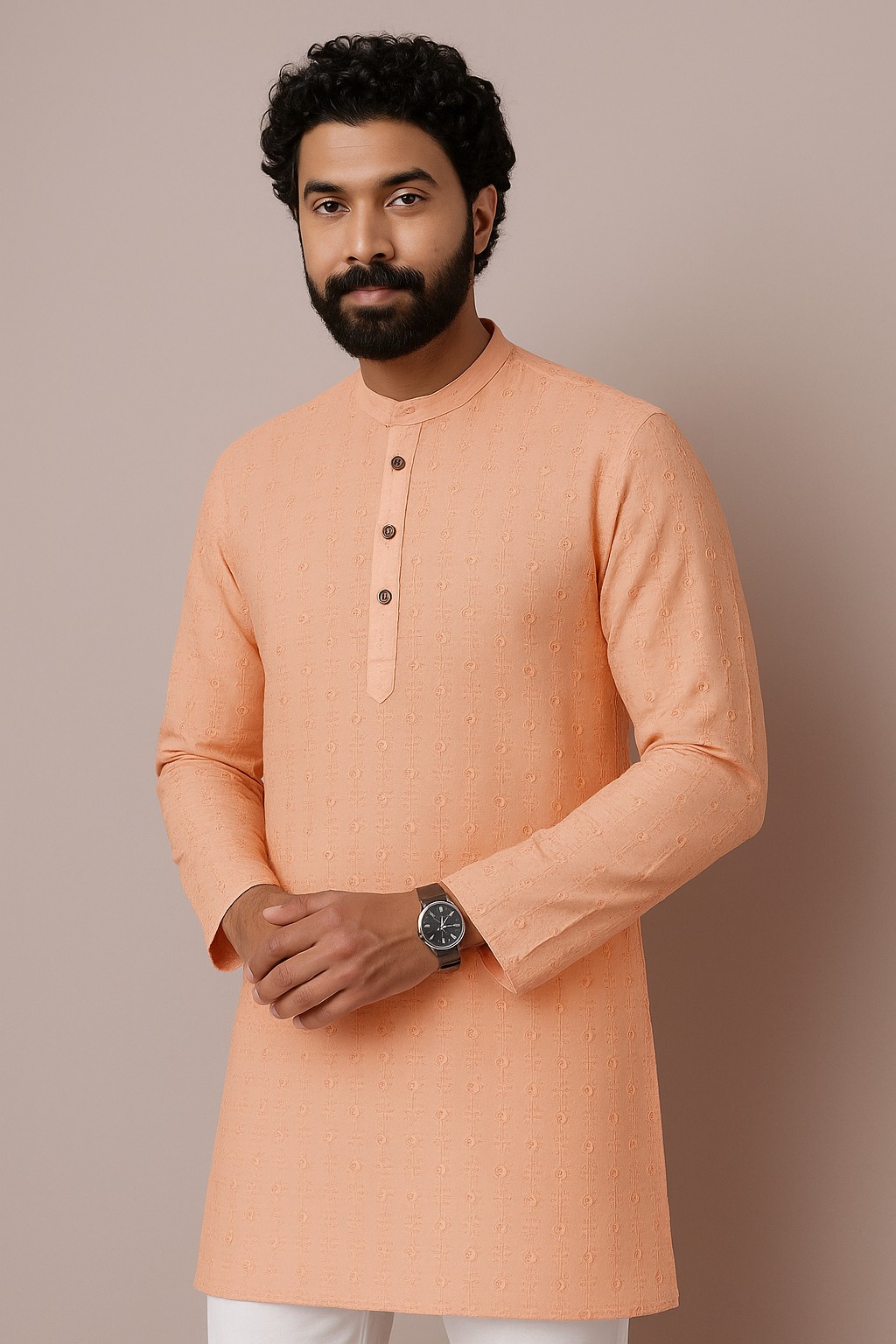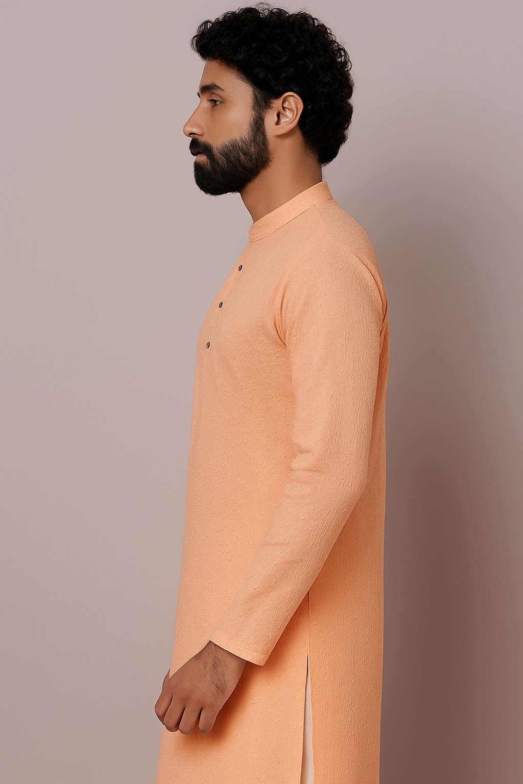 A stylish and comfortable peach cotton kurta crafted from 90% cotton fabric, perfect for casual or festive wear. Featuring a textured design and mandarin collar, this kurta combines tradition with modern comfort.