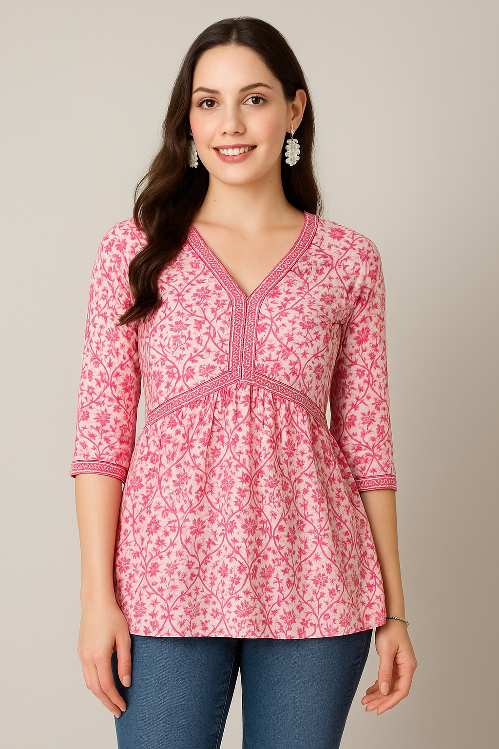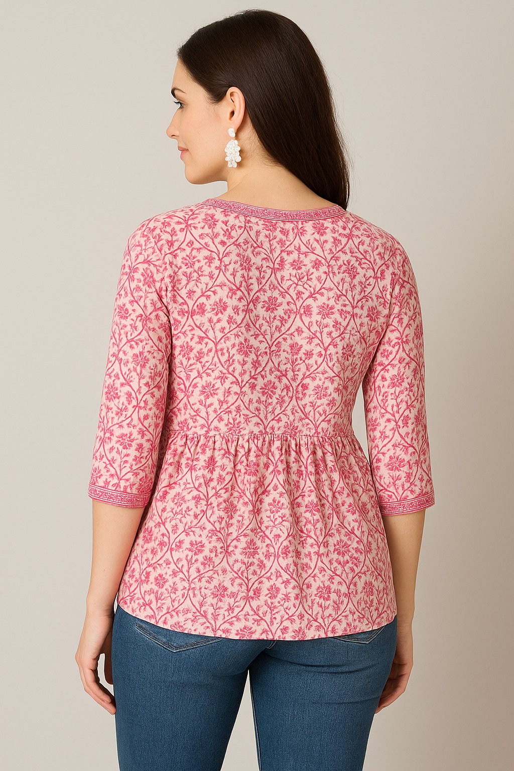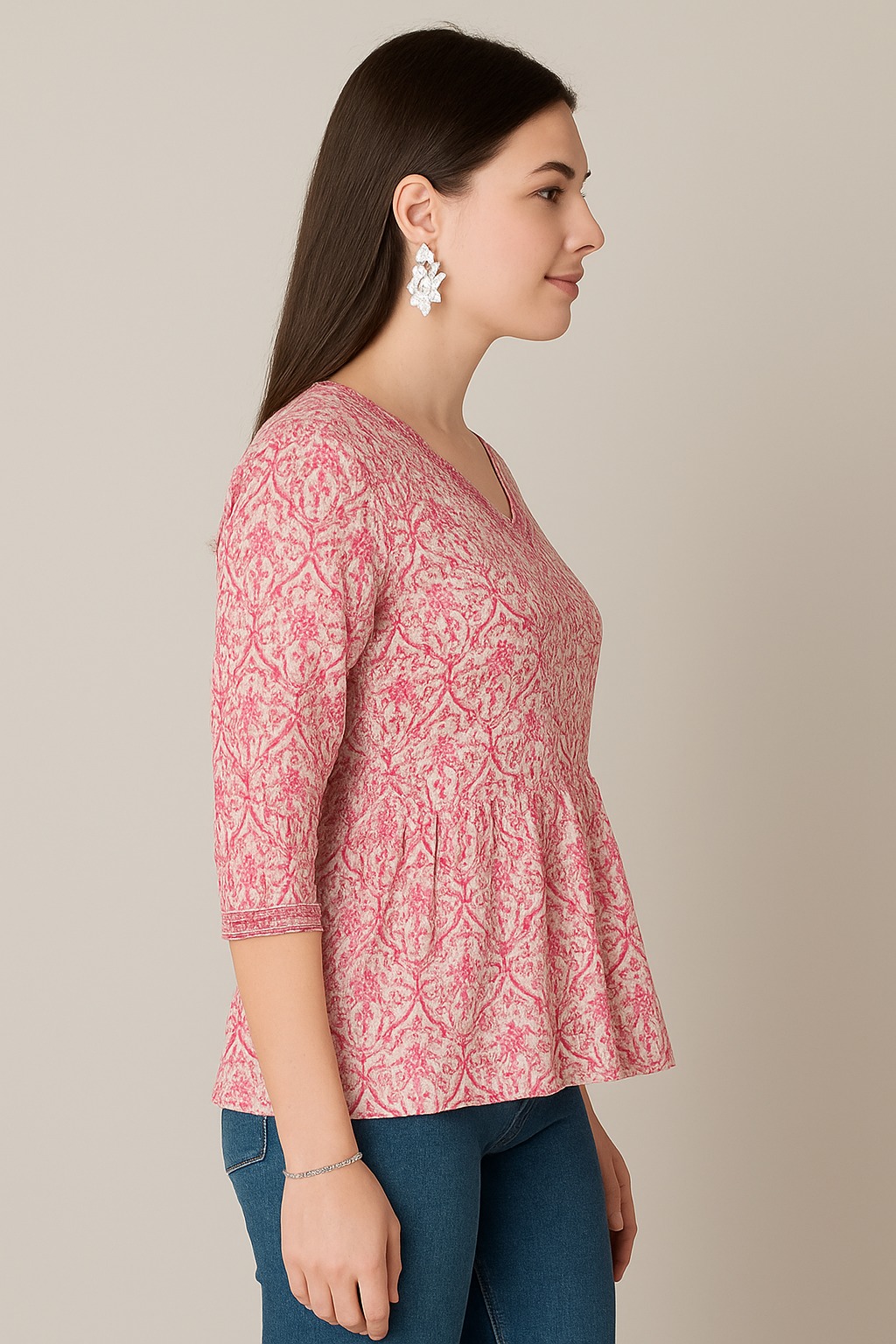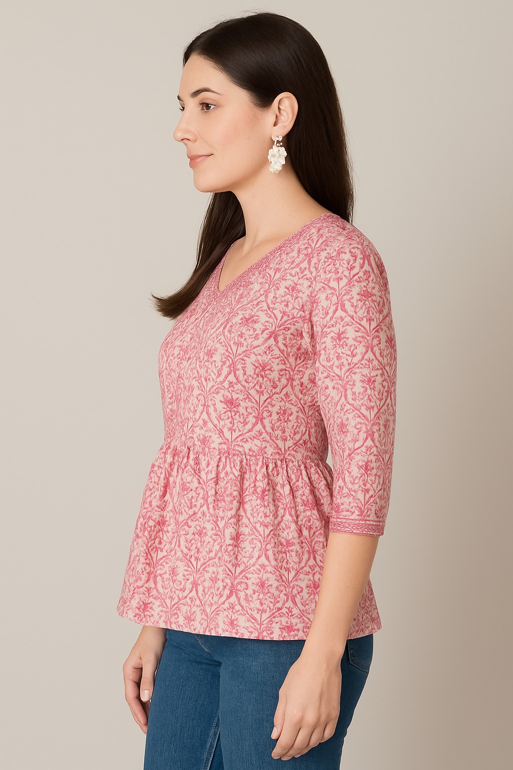 Breathable pink floral peplum top with V-neck and 3/4th sleeves—perfect blend of comfort and ethnic charm.