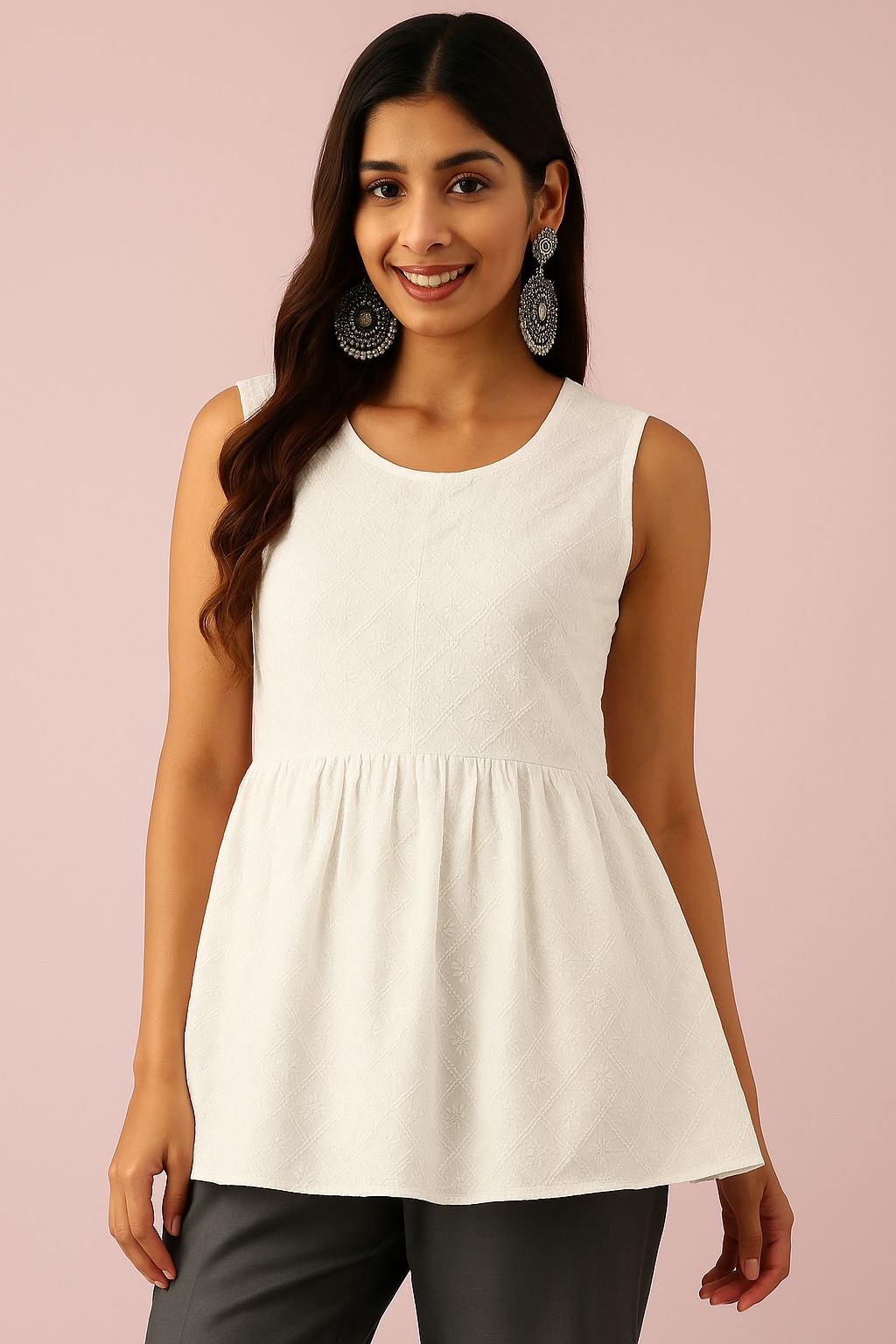 A chic white peplum top with subtle embroidery, perfect for a stylish and flattering look. Ideal for casual wear, offering both comfort and elegance.